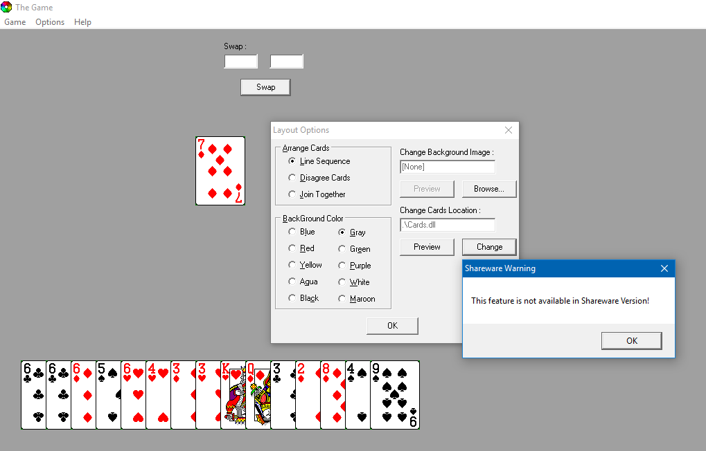 Nem ismertem még a drag&drop módszert, így a kártyákat a "kézben" sorszámok alapján lehetett cserélgetni.